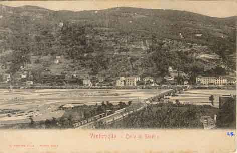 Nella fotografia dei primi del '900 oltre il ponte in ferro della ferrovia si nota il massiccio complesso cel COLLE DI SIESTRO il sito da dove ai primi del XIII secolo il generale genovese LOTARINGO DI MARTINENGO portò l'assalto decisivo, aiutato da macchine nervobalistiche e potenti catapulte sistemate sulla sommità del colle, alle ultime resistenze della città di Ventimiglia