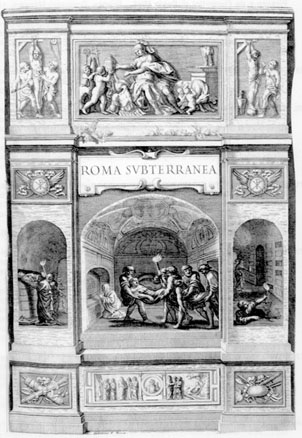 L' ESPLORAZIONE SISTEMICA DELLE CATACOMBE di fatto iniziò con ANTONIO BOSIO (1575-1629) , poi soprannominato il "Colombo della Roma sotterranea", di cui qui si riproduce una significativa INCISIONE della sua celebre opera Roma Subterranea novissima...sex libris distincta illustrantur...opera et studio Pauli Aringhi... (edizione: Roma, Blasij Diversini & Zanobij masotti, 1651: in folio, mm. 426x290) .