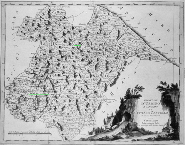 CITTA' DI CASTELLO IN UNA CARTA DEL XVIII SECOLO DELLA "LEGAZIONE PONTIFICIA DI URBINO".