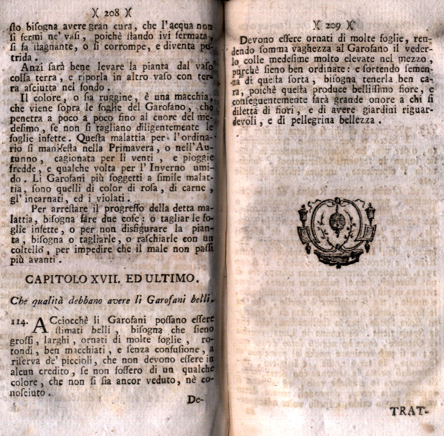 il garofano re dei fiori quanto la rosa č la regina dei giardini dal CAPITOLO DEDICATO ALLA COLTURA DEI GAROFANI nel settecentesca opera Il semplice ortolano in villa, e l'accurato giardiniere in cittąscritta dadi Casimiro Affaitadi)