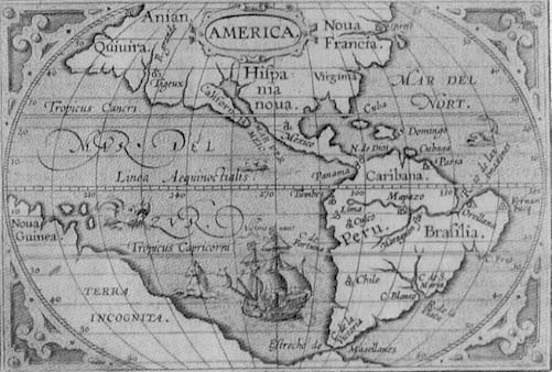 LA CARTA TRATTA DALL'ORTELIO (1609) CI INDICA COME PROCEDESSERO LENTAMENTE LE CONOSCENZE GEOGRAFICHE NEI SITI DEL "NUOVO MONDO" OD "INDIE OCCIDENTALI" DOVE BAN POCHE TERRE AVEVANO ASSUNTO UN QUALCHE MODO TOPONIMI PROSSIMI AGLI ATTUALI