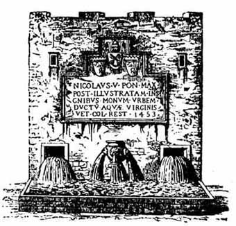 L'acquedotto di "Aqua Virgo", originariamente costruito da Agrippa , venne restaurato da Papa Niccolò, e portava l'acqua in un semplice bacino, progettato da Leon Battista Alberti , che fu il predecessore della Fontana di Trevi .