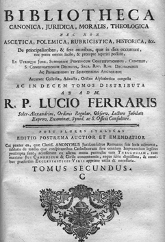 Autore del volume - questo esemplare proviene da raccolta privata - fu il teologo francescano Lucio Ferraris (1687-1763). Questa č una delle ultime edizioni pių documentate ed aggiornate: Bibliotheca canonica, juridica, moralis, theologica nec non ascetica, polemica, rubricistica, historica, &c. ... ab ad m.r.p. Lucio Ferraris ... Tomus primus [-undecimus (Additamenta)]. ..., Post plures Italicas editio postrema auctior et emendator ..., Venetiis : typis Vincentii Radici, 1770-1794 ( 11 v. ; fol - L'indicazione di ed. precede quella di partizione - Cors. ; rom - Testo su due col - Fregio xil. sui front.)