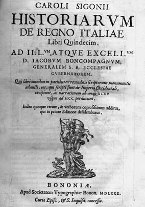 Oltre agli studi filologici sull'antichità ( Regum, consulum, dictatorum ac censorum Romanorum Fasti , A. Gadaldini, Modena 1550; De antiquo iure civium romanorum libri duo, Giordano Ziletti, Venezia 1560), rimarchevoli sono le Historiae de regno Italiae , in venti libri, che espongono i principali eventi italiani dal 570 al 1200.