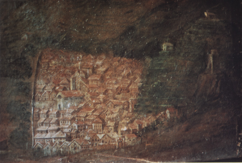 SOPRA IL PAESE AVVOLTO DALLA CINTA MURARIA IN UN QUADRO DEL XVII SECOLO CUSTODITO NELLA PARROCCHIALE DI S. ANTONIO = LEGGI LA DIDASCALIA DEL QUADRO ESTRAPOLATA DAL VOLUME I GRAFFITI DELLA STORIA: "VALLECROSIA E IL SUO RETROTERRA"