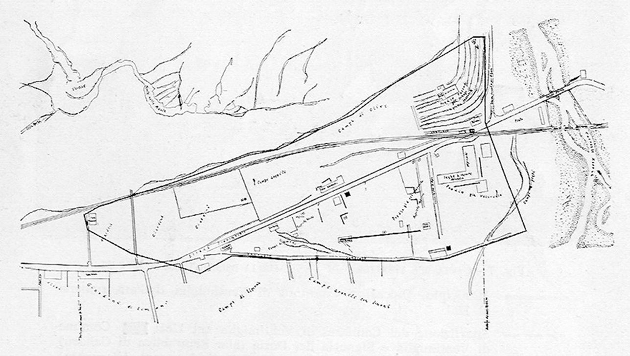 MAPPA TOPOGRAFICA DEL TERRITORIO DI NERVIA, DELINEATA SU INDICAZIONE DI GIROLAMO ROSSI, ANTERIORMENTE ALLA SCOPERTA DEL TEATRO E ALL'INIZIO DELLE GRANDI CAMPAGNE DI SCAVO OTTOCENTESCHE: L'ORIGINALE SI TROVA CUSTODITO PRESSO L'ISTITUTO DI STUDI LIGURI DI BORDIGHERA MENTRE L'IMMAGINE SOPRA INFORMATIZZATA E' STATA ESTRAPOLATA DAL VOLUME DI NINO LAMBOGLIA VENTIMIGLIA ROMANA, I EDIZIONE (INFORMATIZZAZIONE CURATA DA BARTOLOMEO DURANTE)