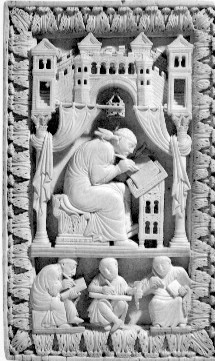 informatizz. B. Durante IN QUESTA "COPERTINA IN AVORIO" DEL X SECOLO CUSTODITA AL KUNSTHISTOROSCHES MUSEUM DI VIENNA SI VEDE PAPA GREGORIO MAGNO IMPEGNATO A SVOLGERE LA SUA INTENSA OPERA INTELLETTUALE ED APOSTOLICA CON L'AUSILIO DI TRE COPISTI