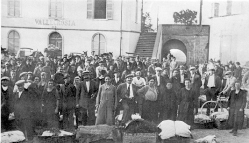 da "Vallecrosia": immagine dei primi del '900 con la Stazione di Vallecrosia davanti alla quale si teneva ancora il locale mercato dei fiori
