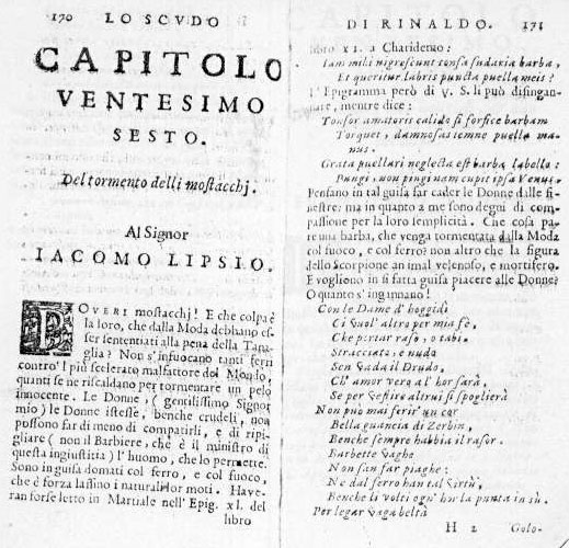 NELL' IMMAGINE SOPRA PROPOSTA SI VEDE LA PAGINA INIZIALE DI UN CAPITOLO (QUI DI SEGUITO PROPOSTO AGLI STUDIOSI NELLA SUA INTEREZZA) DELLO SCUDO DI RINALDO CHE L'ERUDITO E POLIGRAFO ANGELICO APROSIO DEDICO' AVVERSO CERTE ESASPERAZIONI DELLA MODA, NEL SUO SECOLO, DI CURARE OLTREMODO DA PARTE DEGLI UOMINI I PROPRI MUSTACCHI: IL DISCORSO CAPRICCIOSO E CONTRORIFORMISTA NON SOTTRAE PERO' ALLE RIFLESSIONI ANTIQUARIE DEL FRATE LA LORO RILEVANZA IN MERITO AD UN'UTILE DOCUMENTAZIONE SULLE USANZE DEL DICIASETTESIMO SECOLO