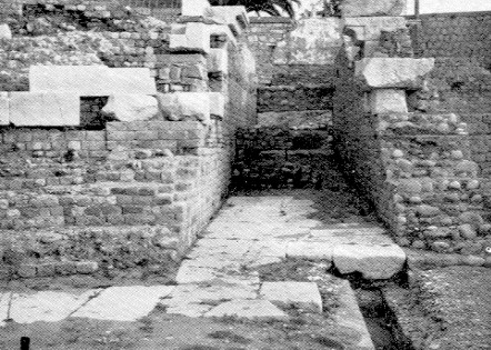 PARODOS ORIENTALE DEL TEATRO ROMANO DI VENTIMIGLIA: LA COPERTURA FU DEMOLITA IN ETA' TARDO ROMANA MENTRE SUL FONDO DELLA PARODOS SI POSSONO TUTTORA VEDERE TRE MURI DI EPOCA BIZANTINA CHE FURONO REALIZZATI PER CHIUDERE LA STRUTTURA ONDE REALIZZARNE QUALCHE STRUTTURA PER ABITAZIONE OD ALTRO INDEFINIBILE USO: L'INTERVENTO DI RESTAURO FU ESTESO ANCHE ALL'ADIACENTE VANO DAL PARASCAENIUM OCCIDENTALE