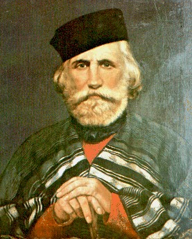 L'olio a tela [(cm.60 x 80), custodito presso la "Società Mutuo Soccorso Reduci Garibaldini", è stato riprodotto dal catalogo Garibaldi nella documentazione degli Archivi di Stato e delle Biblioteche Statali, Mostra storico documentaria a cura dell'Archivio Centrale dello Stato, Roma, Istituto Poligrafico dello Stato, 1982] rappresenta l' EROE DEI DUE MONDI nel vigore dell'avanzata maturità. Il futuro condottiero nasce a Nizza il 4 luglio 1807 in una casa sulle sponde del mare come lui stesso scrive nelle sue Memorie. Delle sue gesta i libri di storia sono zeppi: qualche dato biografico in più merita forse la giovinezza, con le prime esperienze politiche, e il complesso periodo di soggiorno (e di imprese) in Sud America (imprese che congiuntamente a quelle italiane ed europee gli meriteranno l'appellativo di "eroe dei due mondi").