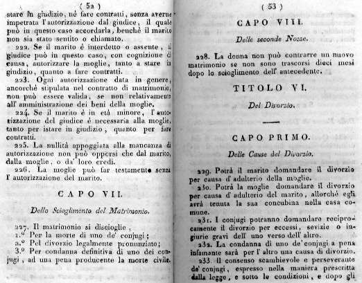 Ebbene, nel contesto di tante novità, soprattutto a Milano e a Napoli, le uniche riserve su cui si soffermarono i governi locali, al momento di tradurre il CODICE in italiano, furono costituite proprio dal forte contrasto dell'ISTITUTO DEL DIVORZIO con il costume nazionale italiano, come ha scritto Carlo Zaghi (pp.380 sgg.): i sentimenti di opposizione furono peraltro analoghi in Liguria e Piemonte anche se, data l'assimilazione di queste regioni all'Impero, non vi poterono essere, in merito al Codice rimostranze di Governi locali (e del resto il Bonaparte si rivelò irriducibile in merito all'introduzione, nei suoi possessi diretti come negli stati satellite, di questo ISTITUTO GIURIDICO).