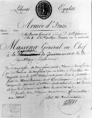 Nella lettera, un esempio di una fitta corrispondenza, il GENERALE MASSENA ragguaglia i membri del Direttorio della REPUBBLICA LIGURE sugli spostamenti del generale austriaco Melas che presto avrebbe imposto a GENOVA un terribile assedio