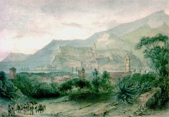L' EVOLUZIONE INSEDIATIVA DEL COMPLESSO A MONTE DEL CENOBIO AGOSTINIANO, DESTINATO POI AD ESSERE OCCUPATO DALLA STAZIONE FERROVIARIA INTERNAZIONALE DI VENTIMIGLIA, LO SI PUO' QUINDI COGLIERE DA UN'ALTRA STAMPA, SEMPRE DI COLLEZIONE PRIVATA MA DEL 1852, IN CUI SI VISUALIZZA NELLA SUA INTEREZZA IL CONVENTO COMPRESO IL SOPRAELEVAMENTO, CITATO DA ANGELICO APROSIO, DESTINATO AD OSPITARE LA SUA BIBLIOTECA (Informatizzazione a c. di B. Durante)]