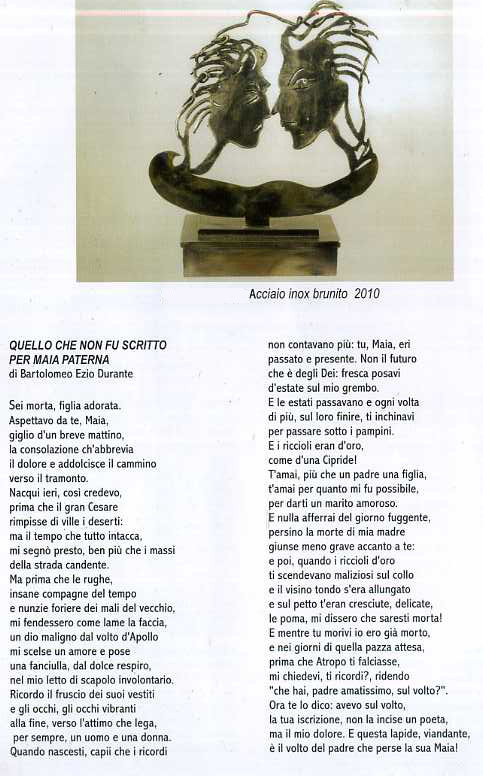 Informatizzazione a cura di B. E. Durante Gli Scavi archeologici nel complesso demico romano a Nervia dell'attuale Ventimiglia hanno permesso di evidenziare molte notizie sugli abitanti di Ventimiglia Romana (Albintimilium) ma come spesso accade vi son cose che più di altre attirano, chi per un verso e chi per un altro: io rimasi sempre colpito da una lapide molto semplice (qui sopra proposta) dedicata a Maia Paterna, una fanciulla morta a soli 11 anni al punto che nell'occasione di un esperimento di interazione tra scultura e letteratura nel contesto di una mostra scultorea di E. Lentini tenuta presso l'Istituto di Studi Liguri di Bordighera (dell'artista toscano tanto apprezzato, specie dall'illustre critico d'arte e scrittore Antonio Aniante è l'opera scultorea che precede la lirica) a corredo di un'opera d'arte che sentivo molto vicina alla storia di questa fanciulla volli proporre (in modo del tutto arbitrario certo) la lunga iscrizione che i genitori avrebbe forse voluto per la figlioletta -se fossero stati estremamente ricchi- in luogo della breve iscrizione su una lapide riutilizzata di cui, non essendo verosimilmente agiati, dovettero accontentarsi. Attraverso i secoli possono persistere certi indefinibili legami suggeriti da suggestioni ed emozioni che l'esperienza archeologica e museale, fuor di qualsiasi riferimento al paranormale, può sublimare: ed io nel corso della mia attività di ricercatore e di docente -anche per il fatto di risiedere a lungo in prossimità degli Scavi Archeologici e soprattutto del Teatro Romano- ho sempre provato sentimenti vari, di compassione, pietà e può sembrare strano di affetto, per questa fanciulla morta quasi 2000 anni fa (da ragazzo ne parlavo spesso coi miei genitori nel contesto di un rapporto profondo ed invidiabile in cui si affrontavano tutti i temi, soprattutto della consonanza degli individui di fronte ai destini terreni a prescindere da spazio, tempo e persino religioni eventuali di appartenenza): con il tempo non ha ella smesso di visitare i miei pensieri e qualche volta persino i miei sogni sì che, rielaborandone poeticamente uno molto vivo, scrissi queste due righe poetiche che, banalmente forse, intitolai come qui sotto si legge e sfruttando, lo confesso, il titolo d'una bella canzone di Ron che, meno supponente della lirica qui proposta, ipotizzava (in un contesto peraltro assai diverso) un reincontro a distanza di "cento anni". Così prese vita la lirica Io e Maia Paterna, incontrarsi dopo mille anni che viveva, come ben si intuisce, in sinergia quella che redassi poco prima per il citato esperimento di interazione fra arte e letteratura intitolata Quello che non fu scritto per Maia Paterna (edita e qui proposta) = entrambe finirono poi ben presto per costituire una sorta di ideale incipit ai fini della sistemazioe in sequenza di altre liriche, strutturate possibilmente secondo i gusti dell'epoca cui dovrebbero appartenere, e di cui per prime son leggibili qui Valerio Osiano e i Maghi della Città del Dolore (la fine del paganesimo antico) ed ancora Cortigiane Regine di Bisanzio e quindi Storia di Tirish e delle tre lettere dalla cui pagina si può poi accedere ad altre composizioni cliccando sulla dicitura in rosso a fondo pagina Clicca per una sequenza di altre poesie di vario tema ed epoca passando a pagine alla cui fine compare analoga scrittura.