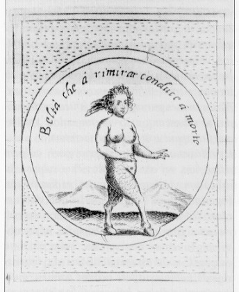 L'INCISIONE DELLA LAMIA (FIGURA MITICA IN QUALCHE MODO RELAZIONABILE ALL'ARPIA) CONSERVATA ALLA BIBLIOTECA APROSIANA DI VENTIMIGLIA APPARTIENE AL VOLUME DI GIOVANNI FERRO, TEATRO D'IMPRESE (VENEZIA, GIACOMO SARZINA, 1623). ESISTE QUESTA ALTRA DESCRIZIONE DELLA LAMIA:"SONO NELLA LIBIA FIERE CON FACCIA DI DONNA E DI BELLEZZE SINGOLARI...CON MAMMELLE ROTONDE E RILEVATE, DI COLORE QUALE SI VEDE NELLA ROSA...SPIRANO DA GLI OCCHI GRATIA E FAVORE...L'ALTRE POI PARTI DEL CORPO HANNO, INVECE DI MOLLA PELLE, DURA CORTECCIA DI SQUAME...MANCANO DI VOCE, E INVECE DI FORMARE PAROLE FISCHIANO A GUISA DI DRAGONE...COSI' VINCONO ESSE L'HUOMO CON FRAUDE ET INGANNO: PERCIO' CHE NUDANO IL PETTO, SCUPRONO LE POPPE...ONDE VEGGENDO EGLI LE ROSE FIORIRE FRA GIGLI...TRATTO DALL'AVIDITA' DI COGLIERE QUELLE E CUPIDIGIA DI QUIVI SATOLLARE L'AVIDA BRAMA..A QUELLE INFELICEMENTE S'ACCOSTA E RESTA...DI LORO PREDA"