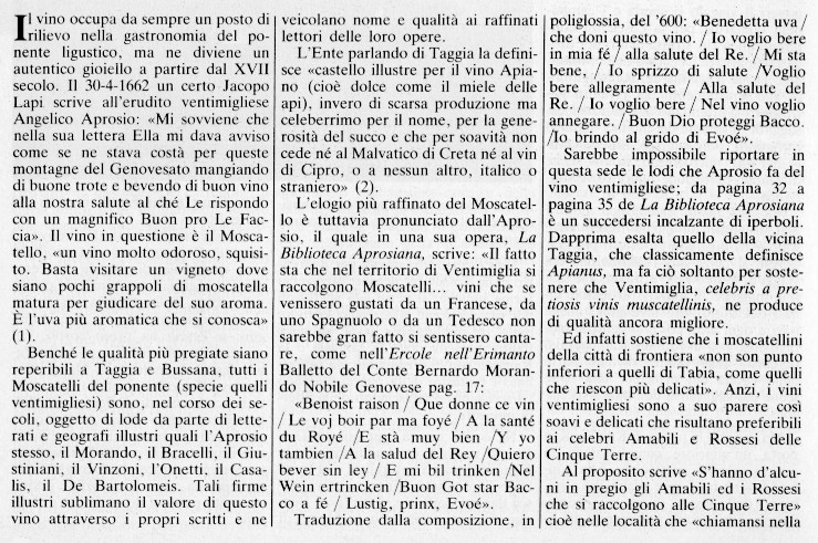 ripr. e informat. Durante da articolo di B. Durante in "LA REGIONE LIGURIA", 1981, 10 dal titolo "ALLA RICERCA DI UN VINO PERDUTO: IL MOSCATELLO DEL PONENTE LIGURE"
