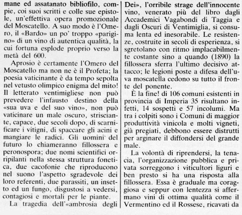 ripr. e informat. Durante da articolo di B. Durante in "LA REGIONE LIGURIA", 1981, 10 dal titolo "ALLA RICERCA DI UN VINO PERDUTO: IL MOSCATELLO DEL PONENTE LIGURE"