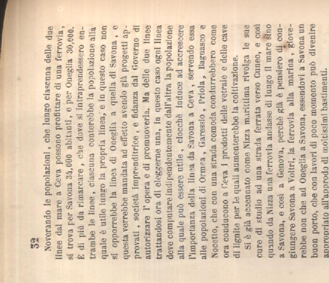 Nell'immagine l' "Estratto della Gazzetta Piemontese" del 25 luglio 1856, n. 181 contenente l'Appendice alla Relazione letta al Consiglio delle Strade ferrate il 12 giugno 1856 intorno al progetto della strada ferrata da Savona a Fossano: il documento è importante in quanto vi è motivata con dettagli di particolari la scelta di realizzare un TRONCO FERROVIARIO MARE-MONTI che congiungesse TORINO-SAVONA e non TORINO-ONEGLIA (PORTO MAURIZIO) come da parecchi caldeggiato. La scelta fu notevole per la storia della viabilità del Ponente Ligure che solo molto tempo dopo, e sempre perigliosamente, avrebbe avuta una sua linea ferrata, passando per Tenda, verso il cuore del Piemonte: conseguenza ciò, senza dubbio, di interferenze negative sull'evoluzione industriale (con penalizzazioni pure di tipo commerciale-mercantile) delle CITTA' PONENTINE a fronte di SAVONA indubbiamente privilegiata da questa pur ponderata scelta del Governo Sabaudo (documento originale in MISCELLANEA di opere varie in "Biblioteca Privata - Durante/ Ventimiglia)