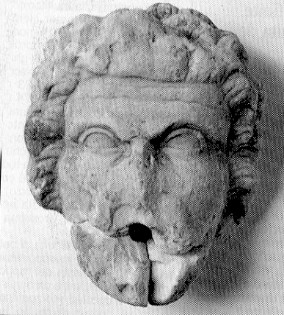 La MASCHERA DI FONTANA ROMANA (I o II sec. d.C.) dell'immagine (tratta dal "Secolo XIX" di Genova del 25-maggio-2001) è stata donata al Comune di Acqui Terme da un privato che l'aveva recuperata ed è stata sistemata nel recentissimo ma già prestigioso Museo Archeologico del Castello dei Paleologi.