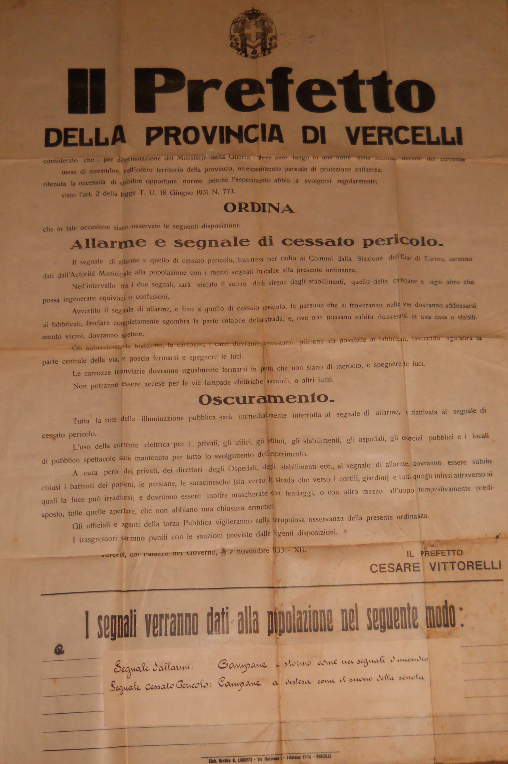 Già di rimpetto alla tragedia del I CONFLITTO MONDIALE lo sgomento sembrò prevalere e la buona volontà parve non mancare con l'istituzione della SOCIETA' DELLE NAZIONI, le postulazioni del DIRITTO UMANITARIO, la messa al bando delle ARMI DI STERMINIO DI MASSA CULMINATE ALL'EPOCA NEI TERRIBILI"GAS ASFISSIANTI" ma tutto verteva ambiguamnte sulla sostanziale debolezza della stessa SOCIETA' DELLE NAZIONI tenendo altresì conto della voglia di rivincita delle NAZIONI SCONFITTE E GIUDICATESI INIQUAMENTE TRATTATE DAGLI ACCORDI DI PACE COME ANCHE QUELLE NAZIONI VINCITRICI QUALI L'ITALIA CHE NON VIDERO RISPETTATI GLI ACCORDI PATTUITI di maniera che i nazionalismi presero a germogliare, sempre più agguerriti, divenendo presto forme di DITTATURA COME NELLA STESSA ITALIA e soprattutto nella GERMANIA HITLERIANA con FORME DI PERSECUZIONE RAZZIALE CHE RAGGIUNSERO L'ACME IN GERMANIA ma senza dimenticare quelle che si proposero anche nell'ITALIA FASCISTA (in cui lo spirito guerresco fu alimentato come dimostrano vari fattori non ultimi i MANIFESTI -COME QUESTO - ESPOSTI ALLA PUBBLICA ATTENZIONE IN RAPPORTO AD ESERCITAZIONI PER OSSIBILI INCURSIONI AEREE NEMICHE) e che fecero parte di una delle massime pagine tragiche della SECONDA GUERRA MONDIALE (pur senza dimenticare i fenomeni altrettanto sanguinosi di persecuzione razziale che avrebbero tormentato drammaticamente una delle MASSIME POTENZE VINCITRICI DEL II CONFLITTO MONDIALE VALE A DIRE L'UNIONE SOVIETICA SOGGETTA ALL'AUTORITARISMO STALINISTA).