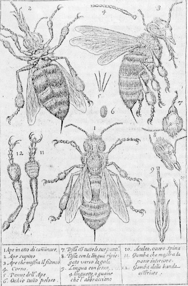 L'INCISIONE DELL'IMMAGINE DIMOSTRA COMUNQUE A QUAL LIVELLO DI CONOSCENZA GIA' NEL '600, IN FORZA DEL MICROSCOPIO SI FOSSE GIUNTI A RIGUARDO DELLE API (ENTRO IL PROCESSO DELLA DOLCIFICAZIONE DAI TEMPI DELLA CLASSICITA' MA NON SOLTANTO: SENZA DIMENTICARE A SECONDA DELLE AREE, DELLE POSSIBILITA' ECONOMICHE, DELLE ACQUISIZIONI ANCHE POSTERIORI IN TALE CAMPO: FICHI, CANNA DA ZUCCHERO, BARBABIETOLA DA ZUCCHERO, ADDIRITTURA ACERO ): COSA GIA' EVIDENZIATA NEL CONTESTO DEL TESTO MULTIMEDIALE PREDISPOSTO, E PRESENTATO AL PUBBLICO PRESSO IL FORTE DELL'ANNUNZIATA DI VENTIMIGLIA (CLICCARE SUL N. 1 DELLA CARTA ANTICA) SU RICHIESTA ISTITUZIONALE DEL COMUNE DI VENTIMIGLIA (SINDACO DOTT. GIORGIO VALFRE' - ASSESSORE ALLA CULTURA DOTT.A RITA ZANOLLA) IN OCCASIONE DELL'EVENTO DEL GIUBILEO 2000 (CON UN AMPIO SETTORE SPECIFICATAMENTE DEDICATO A QUELL BASILARE AREA DI TRANSIZIONE DEI PELLEGRINAGGI CHE FU LA LIGURIA): ARGOMENTO DELLA DOLCIFICAZIONE CONNESSO AI TANTI DI GASTRONOMIA, AGRONOMIA, PASTORIZIA, ALLEVAMENTO, CONTESTUALMENTE AD ALTRI ANCORA PIU' ESTESAMENTE CONNESSI AL TEMA SOCIO-POLITICO-ECONOMICO, SVILUPPATO SOTTO TITOLO DE IL MESTIERE DI VIVERE: CIVILTA', ARTI, USI ECONOMICI, VITA POLITICA TUTTAVIA AMPIAMENTE ARRICCHITO E MODIFICATO, GIA' IN CHIARO SULLA RETE, MA PURANCO POTENZIABILE IN FORZA DI DOCUMENTI OTTENIBILI SU RICHIESTA ENTRO CULTURA-BAROCCA.