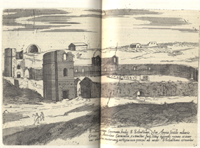 A piedi dell'immagine in traduzione dal latino leggesi Fuori Porta Capena, oggi detta di San Sebastiano, al secondo miliario sulla Via Appia da Antonino Caracalla fu fatto innalzare un Circo. di cui restano grandi rovine e tra queste, non lungi dal Tempio dedicato a Sebastiano, ancora si vedono l'Obelisco e resti delle Mete = il documento è costituito da un'illustrazione facente parte di una serie di altre illustrazioni costituenti l'insieme di disegni intolato "Degli edifici illustri superstiti dellì antica Roma" realizzato a metà del XVI secolo dal fiorentino Giovanni Antonio Dosio, disegni di poi incisi da Giovan Battista Cavalieri che ditò il tutto nel 1569 dedicandolo a Cosimo I di Tosana: agli Uffizi di Firenze si custodiscono gli originali del Dosio mentre dell'opera pubblicata dal Cavalieri è stata realizzata una ristampa a Roma nel XX secolo per i tipi dell'editore Colombo ed accompagnata da una prefazione di Franco Borsi
