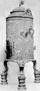 In epoca romano imperiale la grande evoluzione della tecnologia e dell'arte dei bronzisti permise la realizzazione di oggetti straordinari: quello sopra esposto, custodito al Museo Nazionale di Napoli, rappresenta un APPARECCHIO DA RISCALDAMENTO (fotografia Anderson). L'antico bronzista ha saputo coniugare le esigenze tecniche di un'adeguata diffusione del calore con la pregevolezza estetica che si evidenzia in tutto quanto adorna il corpo cilindrico della stufa vera e propria: dalle zampe unghiute e ferine dei piedi di sostegno alla presa delle mani aperte che stringono il corpo del vaso, al gruppo dei lottatori avvinghiati sull'orlo del coperchio -per rafforzare il manico di presa visto che si trattava di una "stufa portatile"- al putto che cavalca il delfino. Simile raffinatezza non era esclusiva solo di Roma o dell'area campana, per esempio di Stabia, Ercolano e Pompei donde provengono reperti come questo: il mercato aperto mondiale patrocinato dalla "pace romana" aveva reso possibile, per i più svariati percorsi mercantili, il traffico di pregiati oggetti di metallurgia e non anche nelle province più lontane: una novità abbastanza ignota al credo corrente è per esempio data dall'esistenza di quelle che si potrebbero definire CUCINE PORTATILI così diverse dalla GRANDI CUCINE DELLE CASE SIGNORILI, DELLE CORTI E/O DELLE STRUTTURE PUBBLICHE DESTINATE A FARE LA STORIA DELLA GASTRONOMIA od anche dalle CUCINE DELLE CASE DELLE CLASSI MEDIO-ALTE.