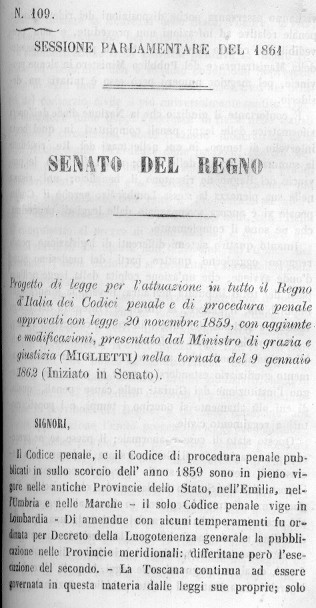 NELL' IMMAGINE SOPRA PROPOSTA SI VEDE IL FRONTESPIZIO DELLA PUBBLICAZIONE DELLA SESSIONE PARLAMENTARE DEL 1861, N. 109 DEL SENATO DEL REGNO OVE SI LEGGE IL PROGETTO DI LEGGE PER L'ATTUAZIONE IN TUTTO IL REGNO D'ITALIA DEI CODICI PENALI E DI PROCEDURA PENALE APPROVATI CON LEGGE 20 NOVEMBRE 1859, CON AGGIUNTE E MODIFICAZIONI PRESENTATO DAL MINISTRO DI GRAZIA E GIUSTIZIA [MINGHETTI] NELLA TORNATA DEL 9 GENNAIO 1862 [INIZIATO IN SENATO]: