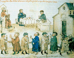 La MINIATURA (QUI VISIBILE IN UNA VARIANTE DI DIMENSIONE E COLLEGAMENTI) sopra proposta, tratta dalle CRONACHE del SERCAMBI, propone una visione del