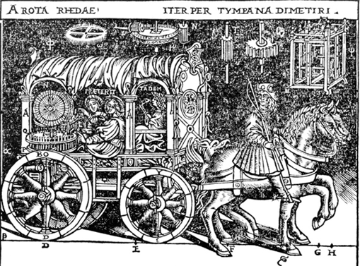 Incisione di un ODOMETRO TERRESTRE dall' opera "Di Lucio Vitruuio Pollione De architectura libri dece traducti de latino in vulgare affigurati: commentati: & con mirando ordine insigniti: per il quale facilmente potrai trouare la multitudine de li abstrusi & reconditi vocabuli a li soi loci & in epsa tabula con summo studio expositi & enucleati ad immensa utilitate de ciascuno studioso & beniuolo di epsa opera",