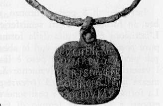 A ROMA GIA' PRESSO IL "MUSEO NAZIONALE DELLE TERME" ORA "MUSEO NAZIONALE ROMANO" RISULTA CUSTODITO QUESTO COLLARE (CIL, XV, 7194; ILS 8731, ARANGIO-RUIZ 127 B = DATATO TRA IL IV ED IL VI SECOLO D.C.) CHE ALCUNI INTERPRETI GIUDICARONO COLLARE DI UNO SCHIAVO RECANTE L'INDICAZIONE, ISCRITTA, DEL PADRONE CHE PROMETTEVA UN COMPENSO A CHI GLIELO AVESSE RICONDOTTO IN CASO DI FUGA. LA SCRITTA INFATTI DICE FUGI, TENE ME/ CUM REVOCUVERIS [SIC!] ME D(OMINO) MEO/ ZONINO, ACCIPIS SOLIDUM (="SONO FUGGITO, TIENIMI PRESSO DI TE ED UNA VOLTA CHE MI AVRAI RESTITUITO A ZONINO IL MIO PADRONE, SARAI RICOMPENSATO CON UN SOLDO") = C. G. BRUNS, FONTES JURIS ROMANI ANTIQUI, P. 362 CFER. WESTERMANN, S. V. SKLAVEREI, R. E., SUPP. VI (1935) 980