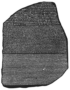 La Stele di Rosetta è una lastra in basalto di 114 cm × 72 cm che pesa circa 760 kg e riporta un'iscrizione con tre differenti grafie: geroglifico, demotico e greco (dall'alto in basso).
