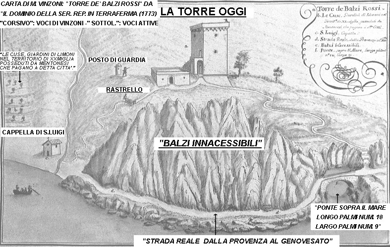 Per farsi un'idea dell'importanza delle OPERE DI NAPOLEONE in merito alla COSTRUZIONE DELLA STRADA DELLA CORNICE può essere utile confrontare il PONTE SAN LUIGI fatto erigere dal condottiero còrso con la preesistente struttura, qui sopra descritta graficamente nella carta Vinzoni-informatizzata