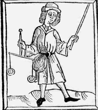 DA QUESTA INCISIONE IN LEGNO DEL '400 SI RICAVA LA TIPOLOGIA DEL CAMBIAVALUTE: EGLI CIRCOLAVA CON UNA BILANCIA DI PRECISIONE PER PESARE LE MONETE DI METALLO PREZIOSO DATO CHE ERA DIFFUSA LA PRATICA CRIMINALE DELLA "TOSATURA" CHE CONSISTEVA NEL SOTTRARRE CON UN'OPERA DI LIMATURA ORO E ARGENTO DAI BORDI DELLE MONETE CONIATE CON QUESTI METALLI. PER QUESTA RAGIONE LE ZECCHE O CASE MONETIERE PRESERO L'ABITUDINE DI IMPRIMERE SEGNI SPECIFICI ANCHE SUI BORDI DEI TONDELLI. COLORO CHE PRATICAVANO QUESTA LIMATURA ( DETTI "TOSATORI" MA ANCHE "ALLEGGERITORI" ERANO CONSIDERATI DAL DIRITTO GENOVESE DEI VERI E PROPRI FALSARI E PER CONSEGUENZA PASSIBILI DI PENE TERRIBILI
