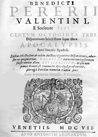 Titolo: Benedicti Pererij Valentini e Societate Iesu. Centum octoginta tres disputationes selectissimae super libro Apocalypsis beati Ioannis Apostoli. Quibus adiectae sunt ab eodem auctore viginti tres disputationes, aduersus eos qui putarunt, Maometem Saracenorum legislatorem fuisse verum illum Antichristum, ..