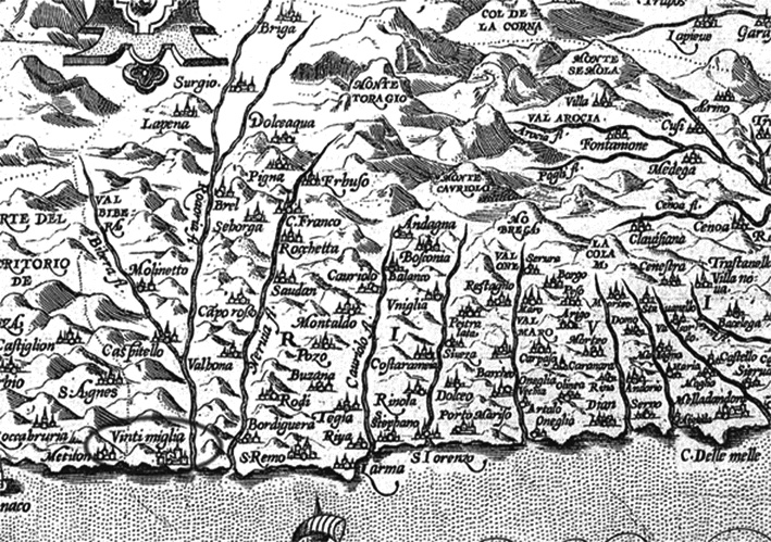 -Trasformazioni ambientali e confinarie, per guerre, calamità ma anche ristrutturazioni, da Nizza a Ventimiglia, Nervia: con cartografia varia, anche dei commissariati di sanità di Ventimiglia e Bordighera dall'Atlante di Sanità di M. Vinzoni e del Theatrum Sabaudiae