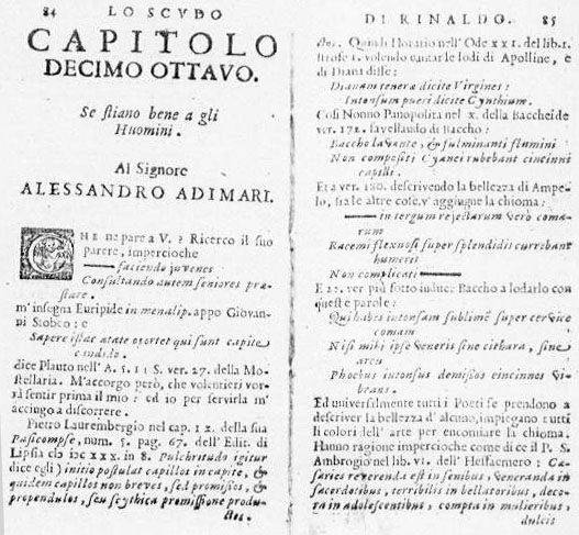 NELL' IMMAGINE SOPRA PROPOSTA SI VEDE LA PAGINA INIZIALE DI UN CAPITOLO (QUI DI SEGUITO PROPOSTO AGLI STUDIOSI NELLA SUA INTEREZZA) DELLO SCUDO DI RINALDO CHE L'ERUDITO E POLIGRAFO ANGELICO APROSIO DEDICO' ALLA MODA DEI CAPELLI LUNGHI DEGLI UOMINI DIFFUSASI NEL SUO SECOLO ANCHE TRA DIVERSI RELIGIOSI (P. 89): IL DISCORSO CAPRICCIOSO E CONTRORIFORMISTA NON SOTTRAE PERO' ALLE RIFLESSIONI CURIOSE DEL FRATE LA LORO RILEVANZA IN MERITO AD UN'UTILE DOCUMENTAZIONE SU CERTI GUSTI PROPRI DELLA MODA DEL DICIASETTESIMO SECOLO E PERALTRO LA SOLUZIONE PROPOSTA NON SEMBRA PRIVA DI BUON SENSO ("NULLA E' PROIBITO PURCHE' VENGA FATTO CON CLASSICA MISURA ED A MAGGIOR RAGIONE SE CIO' CONCERNE GLI UOMINI DI CHIESA CHE DOVREBBERO BADARE PIU' ALLO SPIRITO CHE ALLA CURA DEL CORPO E AD UN'EFFEMINATEZZA OSTENTATA DA CINEDI")