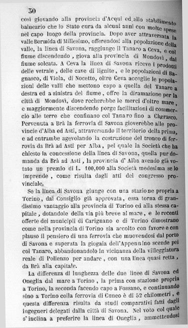 Nell'immagine l' "Estratto della Gazzetta Piemontese" del 25 luglio 1856, n. 181 contenente l'Appendice alla Relazione letta al Consiglio delle Strade ferrate il 12 giugno 1856 intorno al progetto della strada ferrata da Savona a Fossano: il documento è importante in quanto vi è motivata con dettagli di particolari la scelta di realizzare un TRONCO FERROVIARIO MARE-MONTI che congiungesse TORINO-SAVONA e non TORINO-ONEGLIA (PORTO MAURIZIO) come da parecchi caldeggiato. La scelta fu notevole per la storia della viabilità del Ponente Ligure che solo molto tempo dopo, e sempre perigliosamente, avrebbe avuta una sua linea ferrata, passando per Tenda, verso il cuore del Piemonte: conseguenza ciò, senza dubbio, di interferenze negative sull'evoluzione industriale (con penalizzazioni pure di tipo commerciale-mercantile) delle CITTA' PONENTINE a fronte di SAVONA indubbiamente privilegiata da questa pur ponderata scelta del Governo Sabaudo (documento originale in MISCELLANEA di opere varie in "Biblioteca Privata - Durante/ Ventimiglia)