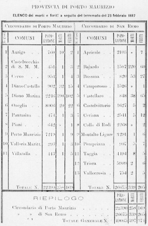 Vedi = Arturo Issel, Il terremoto in Liguria del 1887, Tipografia Nazionale, Roma, 1888 = opera recente: S. Tinti , I maremoti delle coste italiane, Geoitalia, 2007 ]Presso l'ARCHIVIO DI STATO DI IMPERIA - foglio 317 - si custodisce questo ELENCO UFFICIALE DEI MORTI E FERITI della PROVINCIA DI PORTO MAURIZIO (distinta per i CIRCONDARI DI PORTO MAURIZIO e di SANREMO) causati dal TERREMOTO DEL 23 FEBBRAIO 1887: gli AIUTI, che si espressero in vari modi, furono coordinati dal PREFETTO E. BERMONDI CLICCA SULLE FRECCE PER GLI INDICI DELLE VOCI ED INVECE QUI PER LA VOCE TERREMOTI OPPURE QUI POI PER LA VOCE MAREMOTI/TSUNAMI "In quei giorni lontani lo ero un monelluccio di meno di dieci anni (ha lasciato scritto il dottor Amoretti) e la vigilia della catastrofe tellurica ero in grande curiosità per un avvenimento del tutto nuovo per me. Il Sindaco di ONEGLIA [città, come si vede in questa immagine, destinata ad esser gravemente mutilata dalla catastrofe], il buon ing. Berio, per la sera del 22 febbraio, ultimo giorno di carnevale, aveva invitato ad un ballo molte famiglie della città nel suo grazioso castello sul poggio di San Martino ed anche noi avevamo ricevato l'invito...(alla festa, coi genitori, si recarono solo i fratelli Giulio ed Antonietta mentre al minore, appunto Luigi, fu ingiunto di recarsi a letto)