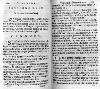 Presso BIBLIOTECA PRIVATA DI VENTIMIGLIA in questo corposo VOLUME TEOLOGICO di FRANCESCO PORTERO si può leggere il CANONE SUL MATRIMONIO (qui di seguito opportunatamente TRADOTTO) DELLA SESSIONE XXIV DEL CONCILIO DI TRENTO