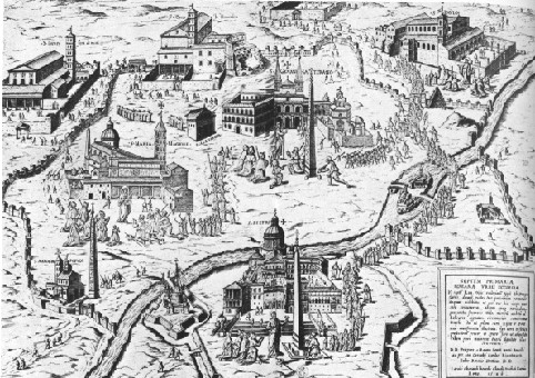 MA COL TRIONFO DELL'UMANESIMO E LA RISCOPERTA DELLA CLASSICITA' ACCANTO ALL'ICONOFRAFIA ESCLUSIVAMENTE AGIOGRAFICA DELLA CITTA' ED A FIANCO DELLE MAPPE REDATTE PER GUIDARE I "VIANDANTI DELLA FEDE" SI ERA AFFERMATA UNA ALTRETTANTO SPLENDIDA DOCUMENTAZIONE DI MINIATURISTI CHE RIPRODUCEVA LE DUE ANIME CONVIVENTI NELLA CITTA', QUELLA RELIGIOSA E QUELLA CLASSICA