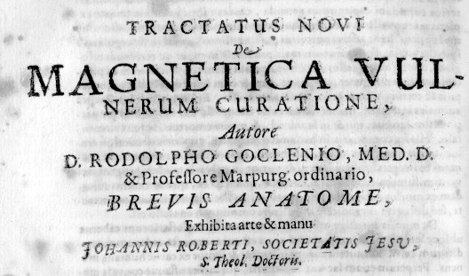 ...Mio caro e comprensivo Lettore/ Quasi improvvisamente e non atteso mi è comparso a fianco, qui sullo scrittorio, un libello che porta questo titolo "Tractatus novus de magnetica Vulnerum curatione, citra ullum dolorem, & remedij applicationem, & superstitionem Autor Rodolphus Goclenius, Med. D. & Profess. Morpurg. Ordin."...
