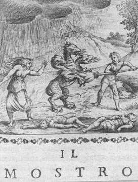 La diabolica creatura è però affrontata con indomito coraggio, nonostante la presenza dei resti umani al centro della stampa vittime del mostro diabolico [PERSONAGGI CHE RAPPRESENTANO I BUONI CATTOLICI MILITANTI ENTRO I SALDI CONFINI DELLE LORO "DIOCESI USBERGO"]: la strega, scalza e con le poppe scoperte ulteriore indizio della sua lascivia consorella dell'impudicizia dei Riformati, altro non sa fare di rimpetto alla coraggiosa reazione di Erinto che maledire fuggendo mentre le nubi che s'addensano paiono un'altra testimonianza delle sue malie e precisamente della " magia tempestaria " che ha scatenato ma che non ferma Erinto.