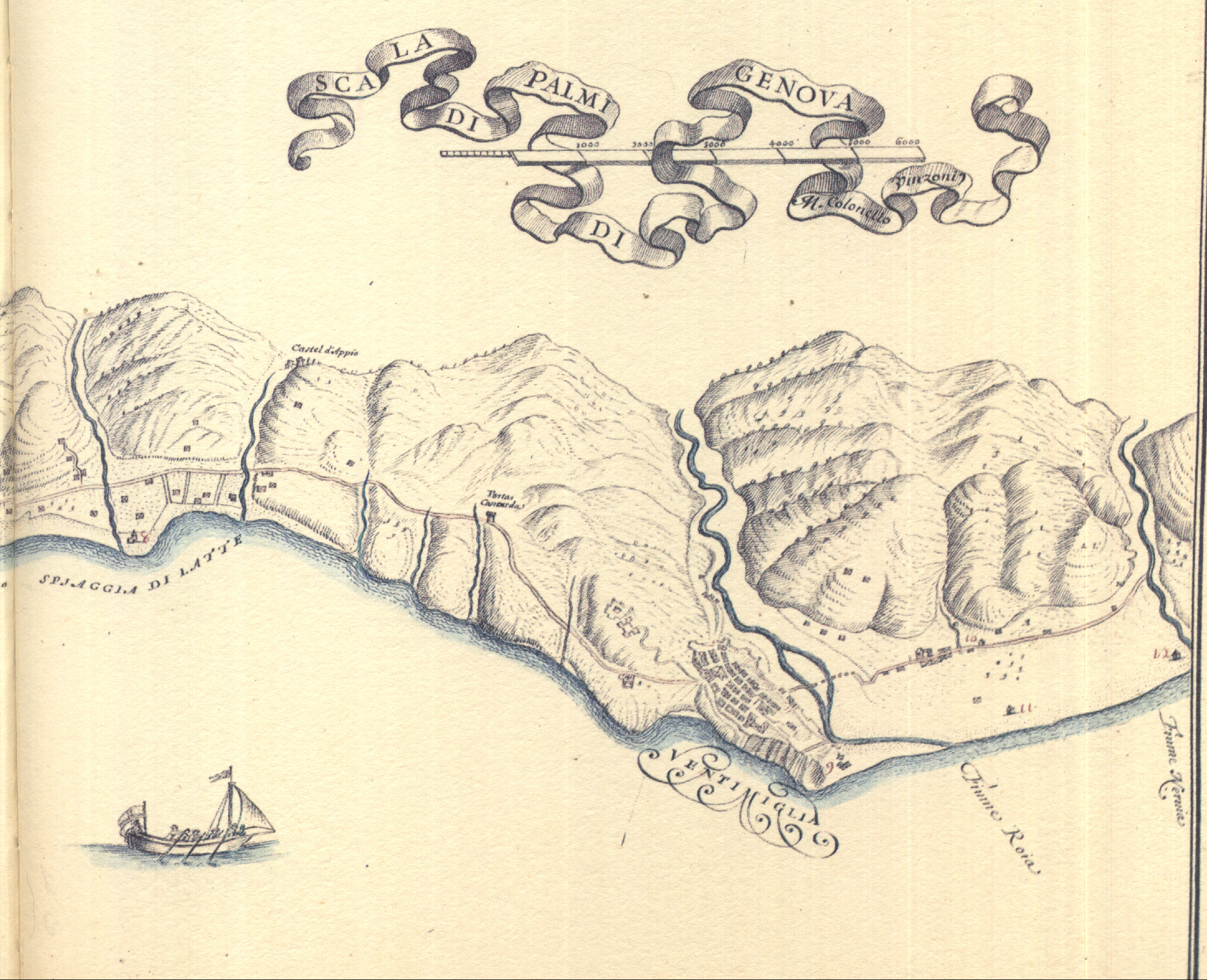 [VEDI CLICCANDO QUI LA GRANDE CARTA, FACENDOLA SCORRERE PER VISUALIZZARLA DALLA SPIAGGIA DI LATTE A NERVIA]. Data la significanza del settore Ventimiglia Nervia per questo ed altri lavori dall'opera di Massimo Quaini, Sagep, 1983 si riprendono qui le dotazioni in uomini, mezzi e strutture delle postazioni numerate nella carta come N. 9 quindi N. 10 poi ancora N. 11 ed infine n. 12 = per un'informazione più completa visualizza cliccando qui integralmente carte e dotazioni concernenti i Commissariati di Sanità sia di Ventimiglia che di Bordighera e come essi fossero guardati da uomini arruolati per la Milizia Nazionale non stipendiata distinta in Militi Scelti e Militi Ordinari che spesso diedero prova, anche nei conflitti e nonostante il modesto armamento, a fronte di quello delle forze ufficiali e dell'esercito regolare (vedi qui un indice di armi nei millenni), prove di grande valore e decisamente superiore a quello dell'esercito vero e proprio, soprattutto delle truppe mercenarie svizzere e tedesche come in occasione delle guerre seicentesche contro il Piemonte Sabaudo e particolarmente in occasione dei conflitto del 1625 e del 1672 [la validità di queste truppe dette anche globalmente dei "militi villani" era già stata dimostrata ai tempi delle incursioni dei Turchi (vedi qui un elenco di armamenti terrestri e navali dei soldati dell'Impero Ottomano) impegnati nel cinquecentesco assedio della sabauda Nizza ma non restii a distaccare forze dalla propria armata impegnata in tale assedio (nel cui contesto, come in tutta la guerra tra Francesco I e Carlo V non mancò di tracce d'ambiguità il comportamento tenuto dall'ammiraglio genovese Andrea Doria) ad avvalersi della guida di rinnegati cristiani cioè di cristiani apostati passati all'Islam e dai nomi spesso particolari ed emblematici onde spingersi verso il Ponente di Liguria (vedine una settecentesca cartografia) allo scopo di investirlo militarmente per depredare e far schiavi (la carta antica è attiva e sono multimedializzate tutte le voci dei borghi evidenziati) sia per quanto concernette la difesa di Vallebona quanto quella di Taggia destinata a far editare nel 1639 ( per i tipi dello stampatore G. A. Magri di Pavia) da Stefano Rossi con lo pseudonimo di Nofaste Sorsi un poema in dialetto di Taggia dal titolo L'antico valore de gli huomini di Taggia]. Diverso, durante la guerra del 1625, fu per vari aspetti il comportamento dei "Militi Ordinari e Scelti" a Ventimiglia, restando pur sempre alta testimonianza di coraggio e bellicosità a fronte del nemico sabaudo = in tal anno di guerra solo i militi villani (appunto reclutati tra i solidi abitanti delle ville ma anche tra il ceto popolare intemelio) si opposero arditamente a Carlo Emanuele di Savoia e la loro ira insurrezionale si scatenò poi in una vera e drammatica rivolta cui aderì la popolazione non abbiente urbana e non, militarizzata e non contro i comandanti delle poche truppe di Genova (pronti a rapida fuga) e contro i Magnifici di Piazza disposti a una resa disonorevole di Ventimiglia e delle sue fortificazioni. Il Vescovo Gandolfo, per quanto apprendiamo da una Relazione presumibilmente di G. G. Lanteri qui proposta indubbiamente filonobiliare, pacificò gli animi inaspriti dei "villani" che s'erano riversati a centinaia nella città, depredando ogni cosa (grazie al Prelato e con l'aiuto della Spagna la Repubblica il 14 settembre, riprese Ventimiglia e ville (occupate dai "nemici") pacificandosi ufficialmente col Piemonte nel 1634): degli eventi esiste pure una contestuale Relazione del Vescovo Gandolfo (qui del pari riportata e commentata). Siffatta relazione del vescovo Gandolfo che venne consultata presumibilmente dal Lanteri fu trascritta entro una sua opera dal II Bibliotecario dell'Aprosiana Domenico Antonio Gandolfo come qui si legge = non fu certo una bella pagina di storia ventimigliese ma i militi villani e del popolo trascinando la restante popolazione in una rivolta antinobiliare ed antigenovese se da un lato testimoniarono la loro avversione ai ceti dominanti e in particolare alle forze di Genova, in fuga pur in una situazione oggettivamente difficilissima ma abbandonando, con una pronta ritirata, gli umili ed altri cittadini ad un rischioso destino provarono ineluttabilmente che l'istituzione della "Magnifica Comunità degli Otto Luoghi" con la separazione delle ville da Ventimiglia stava divenendo inevitabile e ad onor del vero non si può far a meno di rammentare come fossero proprio le guide storiche dei villani e popolani a rimanere al loro posto per ottenere da Agapito Negrone [Commissario genovese per la città di Ventimiglia] nel corso della sua premurosa fuga onde imbarcarsi, per Genova, su una galea, l'autorizzazione per la capitolazione della città, atto rogato su due piedi da un notaio delle Ville ed in fretta e furia controfirmato dal Negrone alle ore 24 del 19 maggio 1625) di modo che quanti rimasero a Ventimiglia poterono inviare, quasi subito cioè alle 0,30 del 20 maggio, due frati del Convento di S. Agostino dal Principe Sabaudo Vittorio Amedeo [ Torino, 8 maggio 1587 – Vercelli, 7 ottobre 1637 fu duca di Savoia e sovrano col titolo di Vittorio Amedeo I dello Stato sabaudo dal 1630 al 1637: e pure re titolare di Cipro e Gerusalemme ] a Bordighera al fine di ottenere un "passaporto" di maniera che, grazie a questo, potessero colà alle ore 3 recarsi tre Deputati, due di Città ed uno delle Ville con l'atto di capitolazione = destinati, comunque, ad attendere angosciati il succedersi degli eventi prima di apprendere che non sarebbe stato dato alcun saccheggio alla già provata città soltanto verso le ore 7, con l'assicurazione fatta al Vescovo intemelio dal Marchese Dogliani, recatosi a Ventimiglia, tra le ore 9 e 10 dello stesso giorno 20 maggio [dai qui digitalizzati Secoli Cristiani della Liguria in merito alla Diocesi di Ventimiglia si legga in merito alla figura del vescovo le conseguenze del suo operato atteso che il Governo 