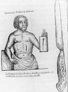 Nell'immagine (incisione da Cultrivori Prussiaci curatio singularis di Daniel Becker edito a Lione nel 1640) è riprodotto un singolare caso: l'asportazione di un coltello ingoiato per un singulto da un contadino prussiano mentre si cercava di aiutarlo a liberarsi col vomito del troppo cibo ingurgitato: l'operazione chirurgica che lo salvò fu all'avanguardia per l'epoca. All'epoca però si riteneva che il vomito di oggetti solidi e insoliti fosse soprattutto una caratteristica di INDEMONIATI e POSSEDUTI indotti a rigettare siffatti materiali incredibili e quindi DIABOLICI in forza di un procedimento di ESORCISMO.