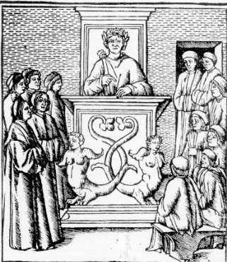 La bella INCISIONE sopra proposta rappresenta PIETRO DE' CRESCENZI assiso nel far lezione: fu infatti autore di uno dei più importanti testi di agronomia (stampato per la prima volta nel 1471 e pubblicato in traduzione italiana nel 1478) che hanno attraversato con successo e gran rinomanza il medioevo (il CRESCENZI nato a Bologna nel 1230 vi morì nel 1320) per raggiungere il XVII secolo: addirittura il re di Francia Carlo V nel 1373 volle che ne fosse fatto un volgarizzamento in francese per l'importanza pratica che gli attribuiva personalmente.