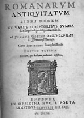 Rosinus, Iohannes, " Romanarum antiquitatum libri decem, ex variis scriptoribus summa fide singularique diligentia collecti, a Ioanne Rosino Bartholomaei ... Cum indicibus locupletissimis", Genevae: Gamonet, Estienne, 1611